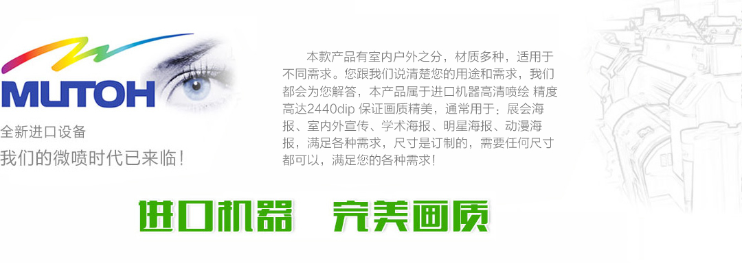 1、进口机器高清喷绘 精度高达2440dip 保证画质精美,通常用于 展会海报 室内外宣传 学术海报 明星海报 动漫海报,满足各种需求